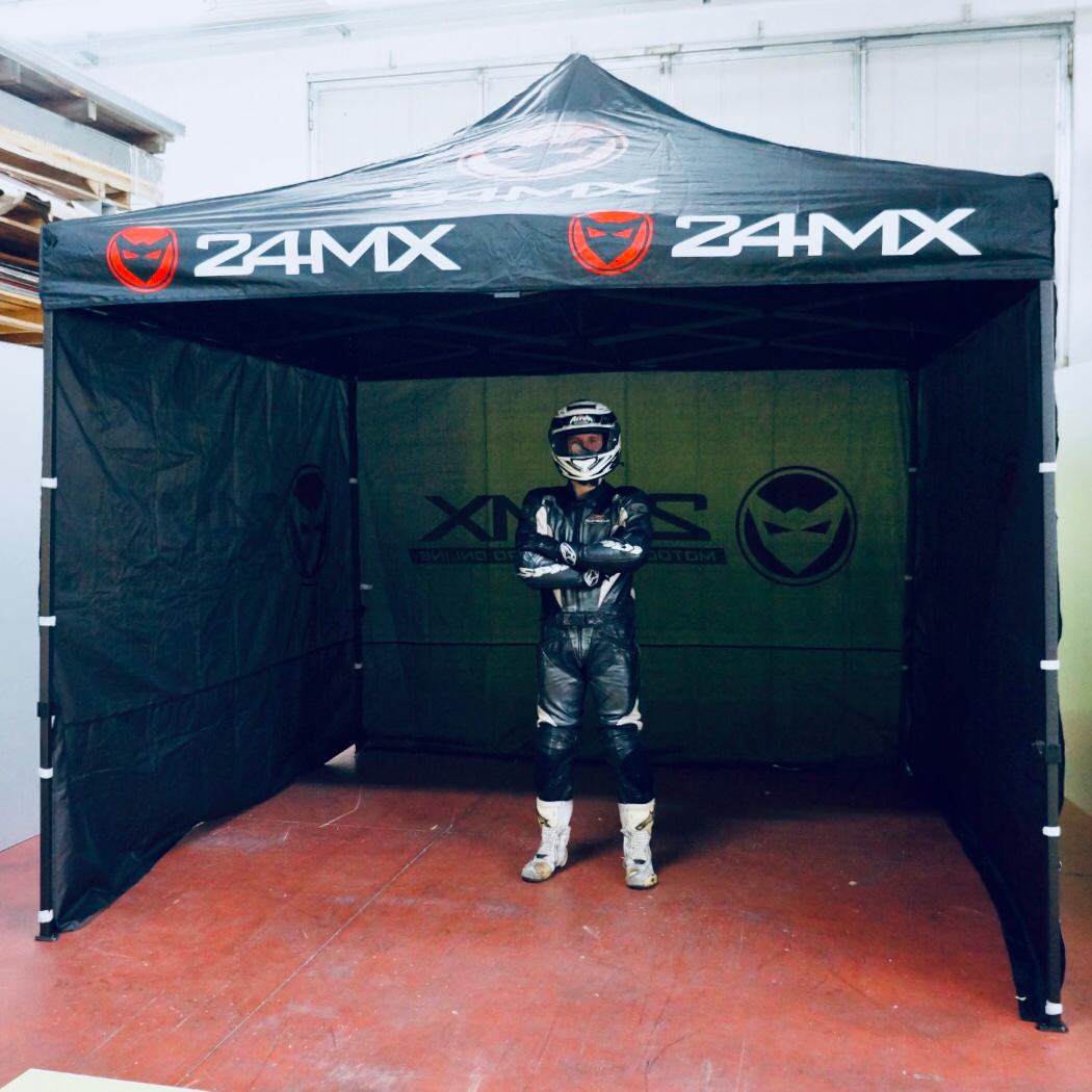 Ho testato per 24MX il gazebo Race Easy- Up. E’ il classico gazebo utilissimo per gli amanti della pista, che tra un turno e l’altro vogliono poter stare al fresco e tenere la moto all’ombra: è infatti grande 3mt x 3, e alto 3,2 mt, dunque molto ampio. Nonostante le sue dimensioni, si chiude facilmente in un involucro resistente e facilmente trasportabile, in cui porre il gazebo una volta chiuso, che diventa alto 1,5 mt x 30 cm.