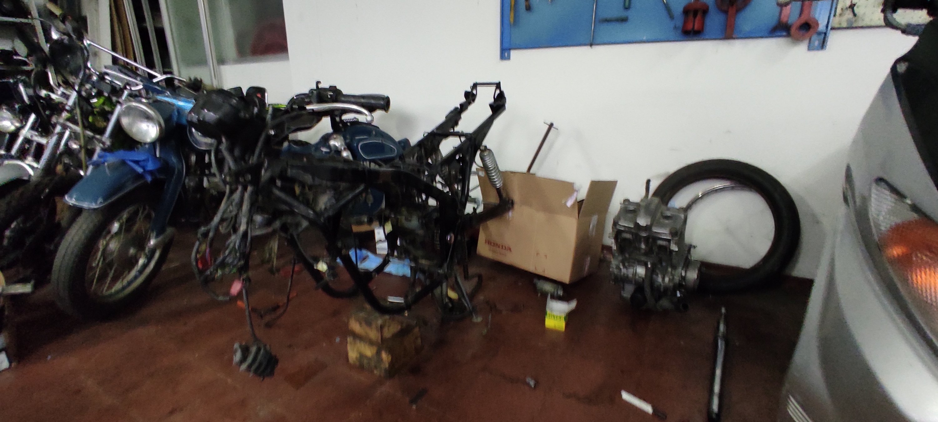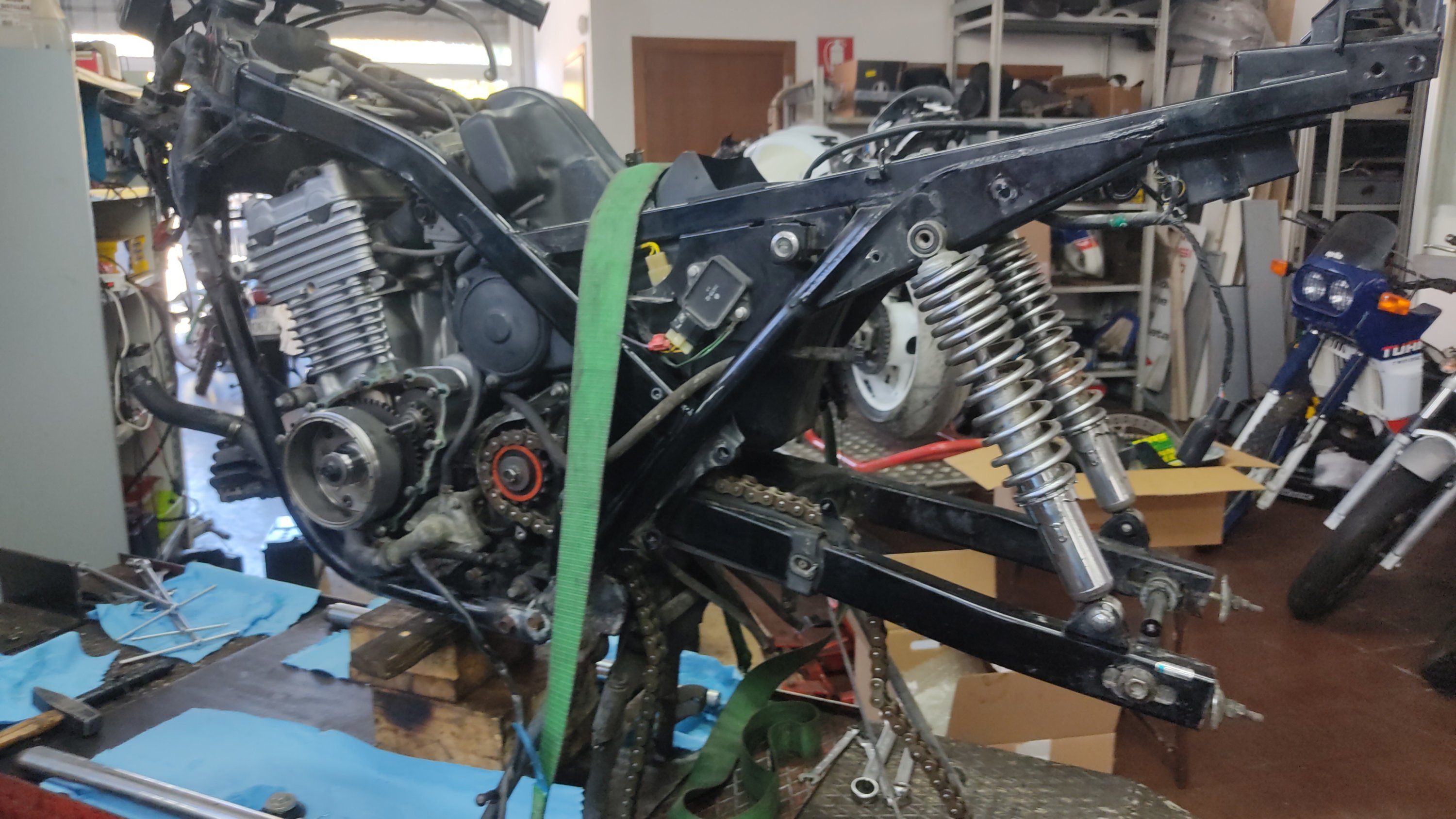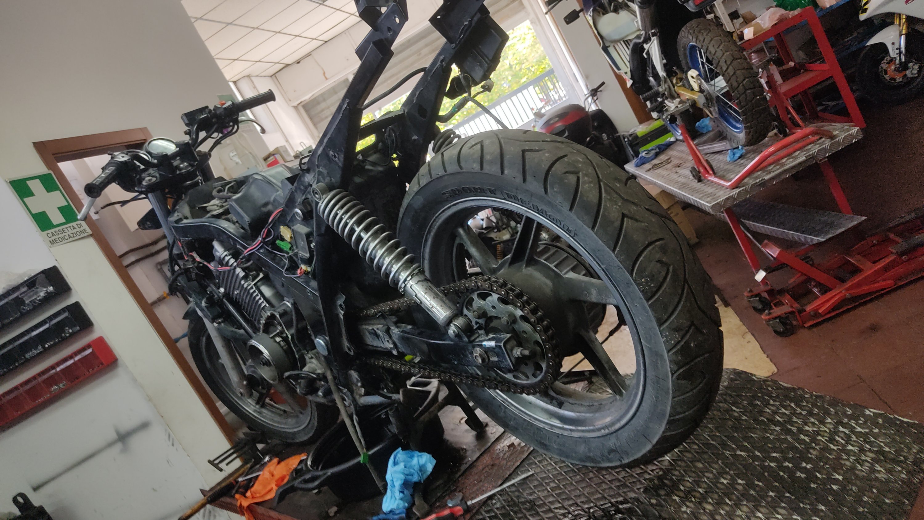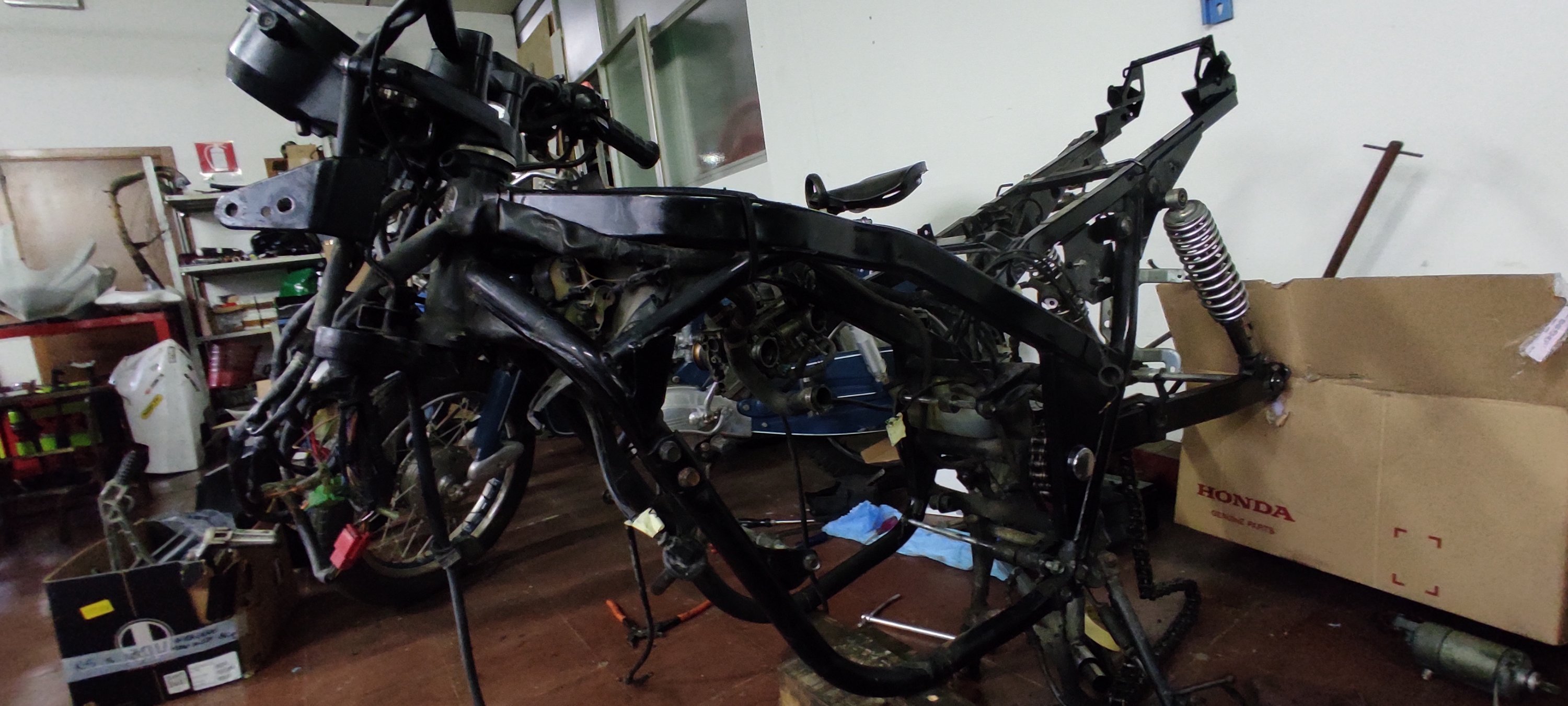 Poi ho trovato chi poteva aiutarmi, un meccanico della zona di cui avevo sentito solo lodi, Marco Pennesi. Ci ho parlato, mi è sembrato avesse capito cosa volevo e come, ed è venuto nel mio garage a raccogliere tutti i pezzi della moto. Mi ha anche permesso di andare tutti i sabato mattina per qualche mese nella sua officina per farmi mettere le mani alla moto, ovviamente facendo lavoretti molto semplici, ma aveva capito che volevo metterci le mani io in prima persona.